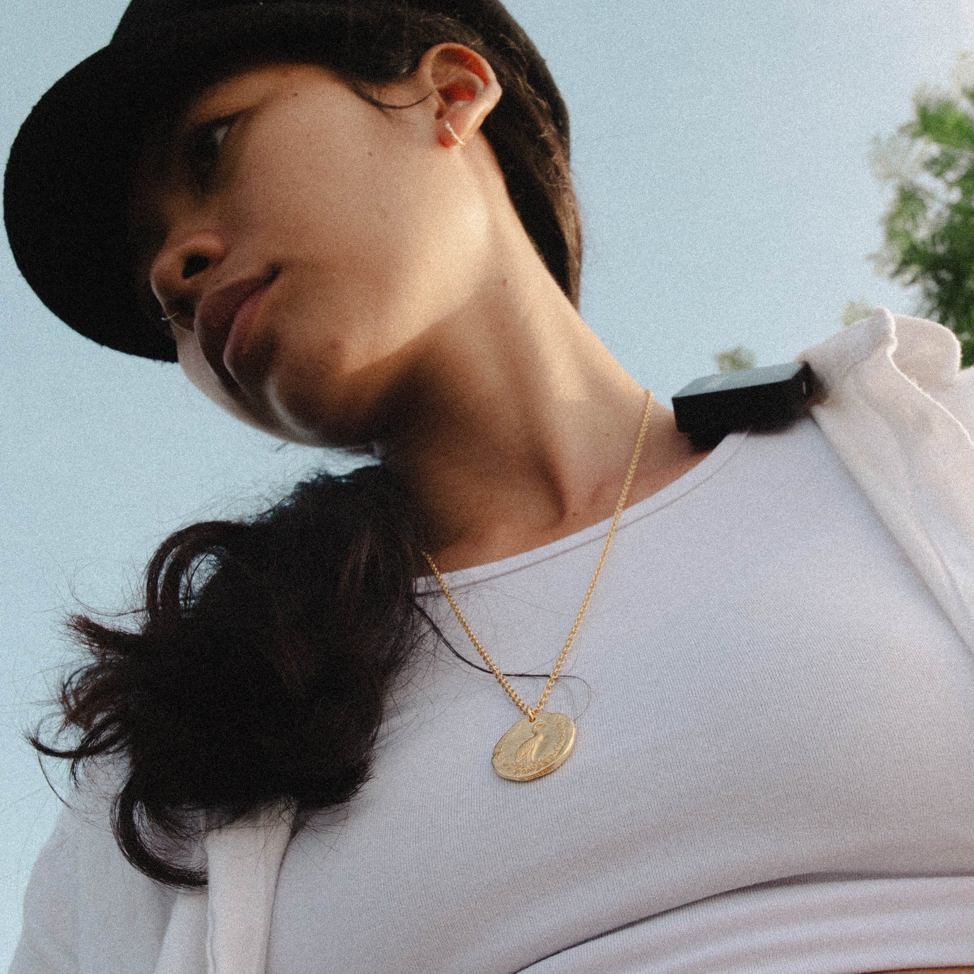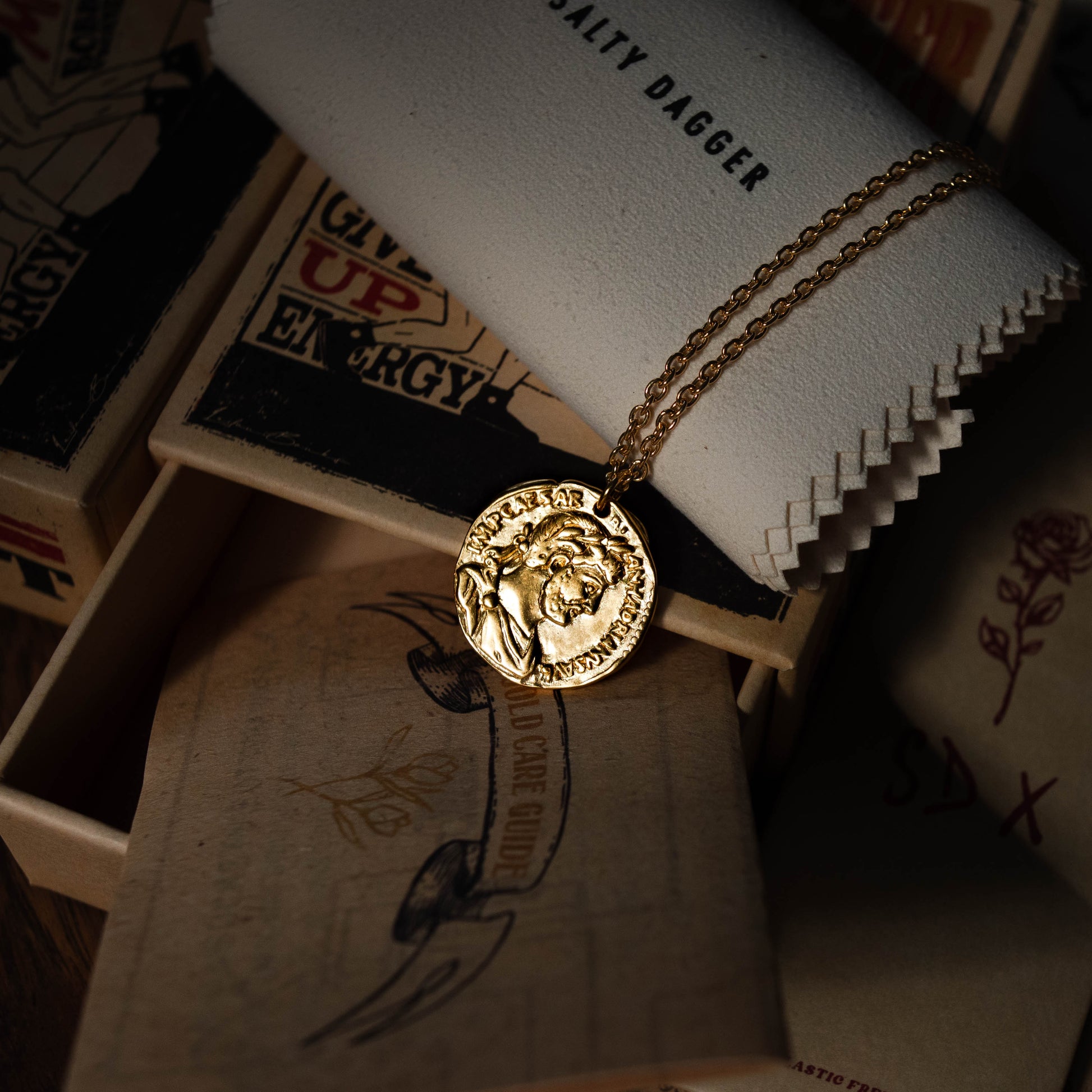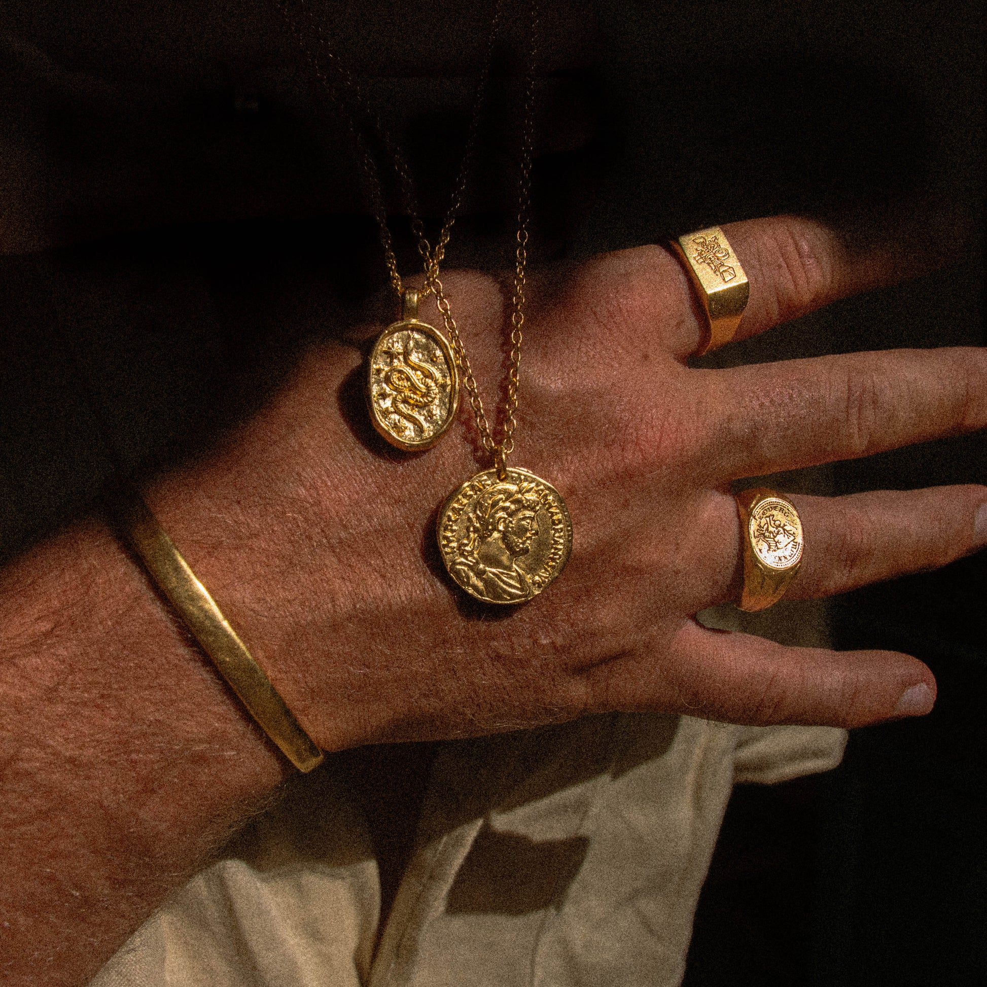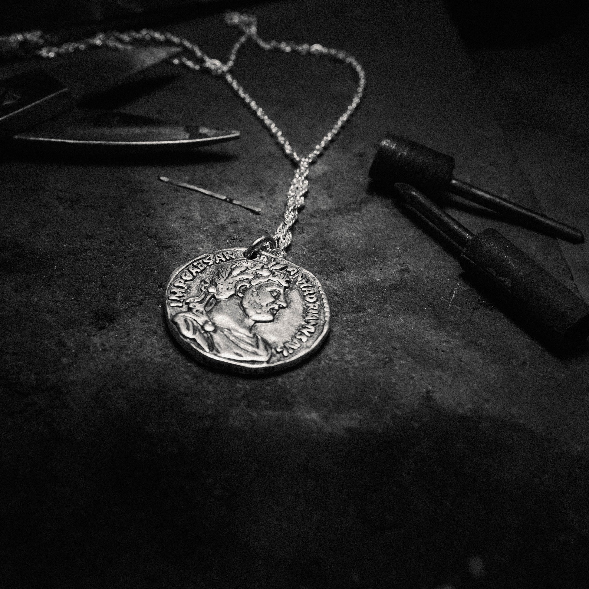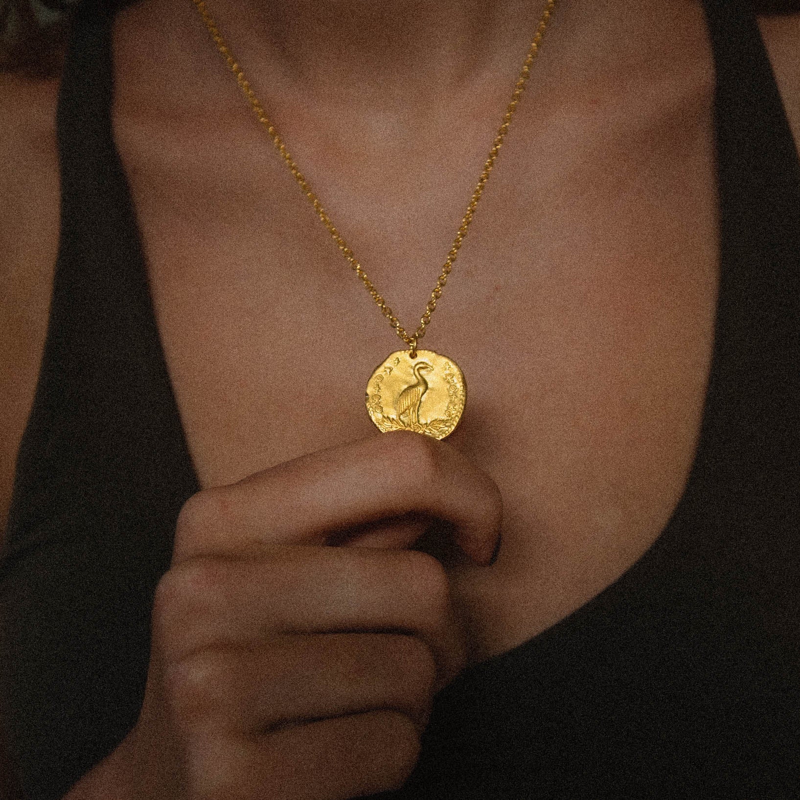 A handmade medallion style pendant with a cable chain. This piece has a solid 100% recycled 925 sterling silver core, and is plated with 3.5 microns of 24k gold. An additional layer of 18k gold is used to add even more strength to the coating. The pendant is designed to look like an ancient coin, featuring a phoenix motif with a wreath of leaves on one side, and a portrait of Marcus Aurelius on the other. The texture of the piece is authentically ancient, telling the story of time's passage.