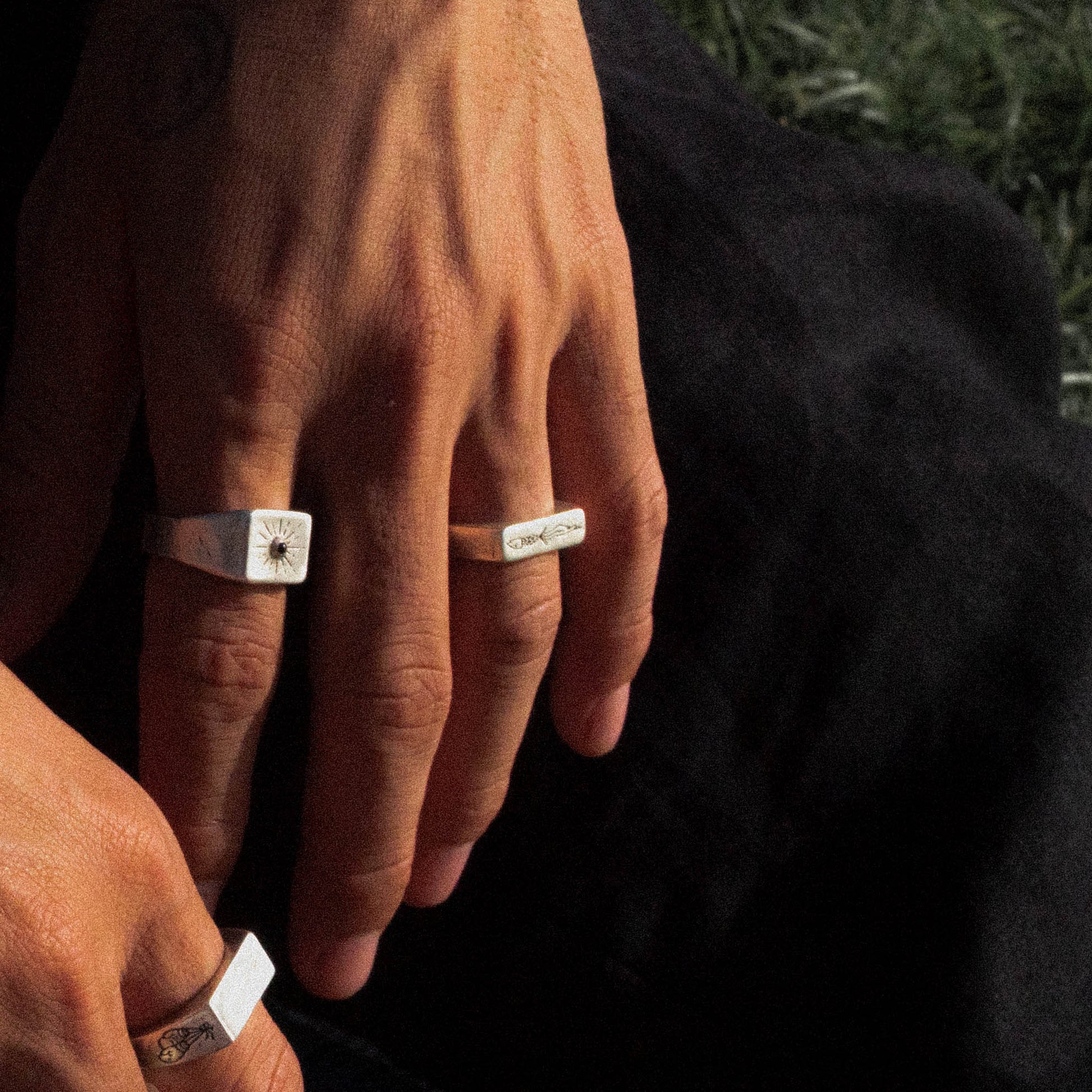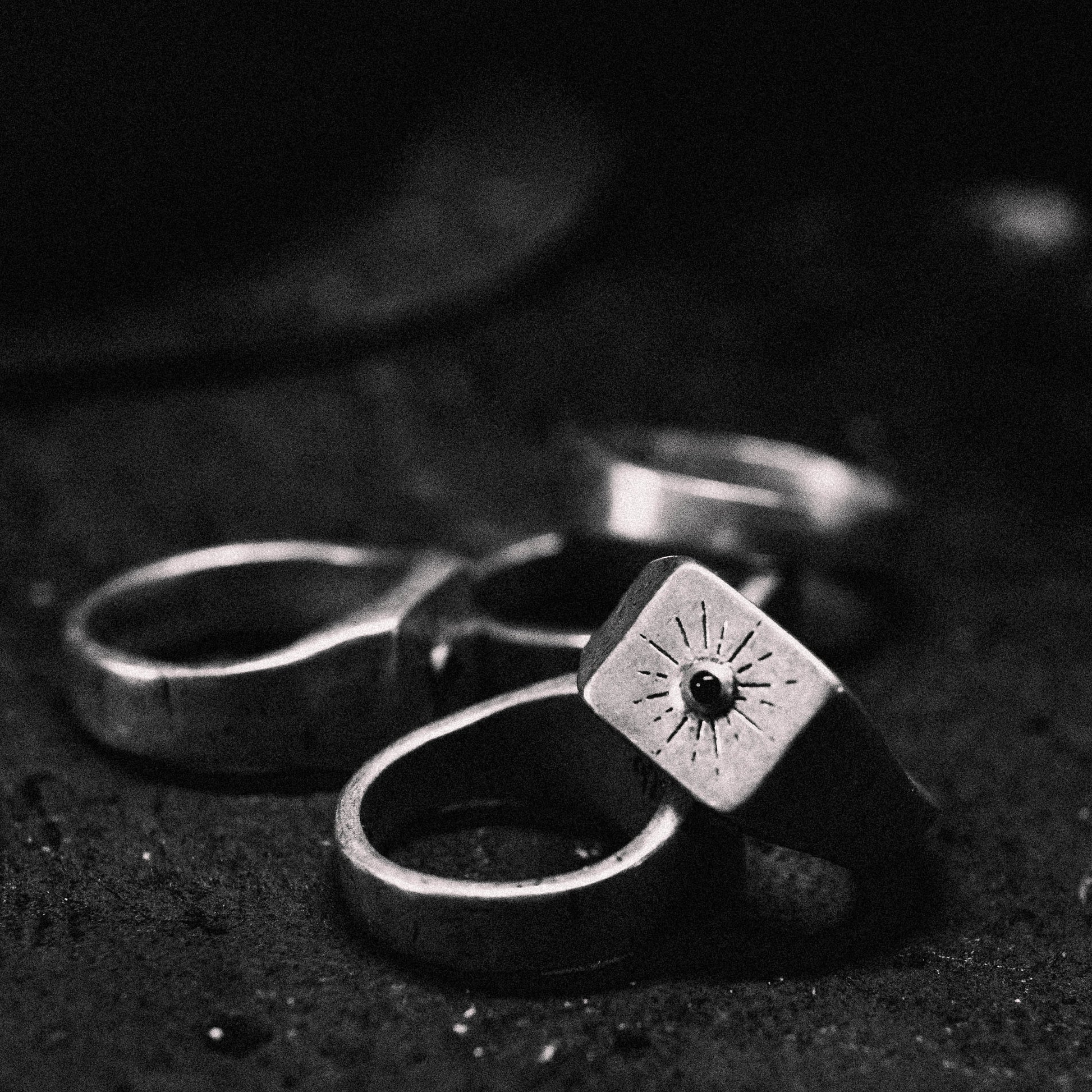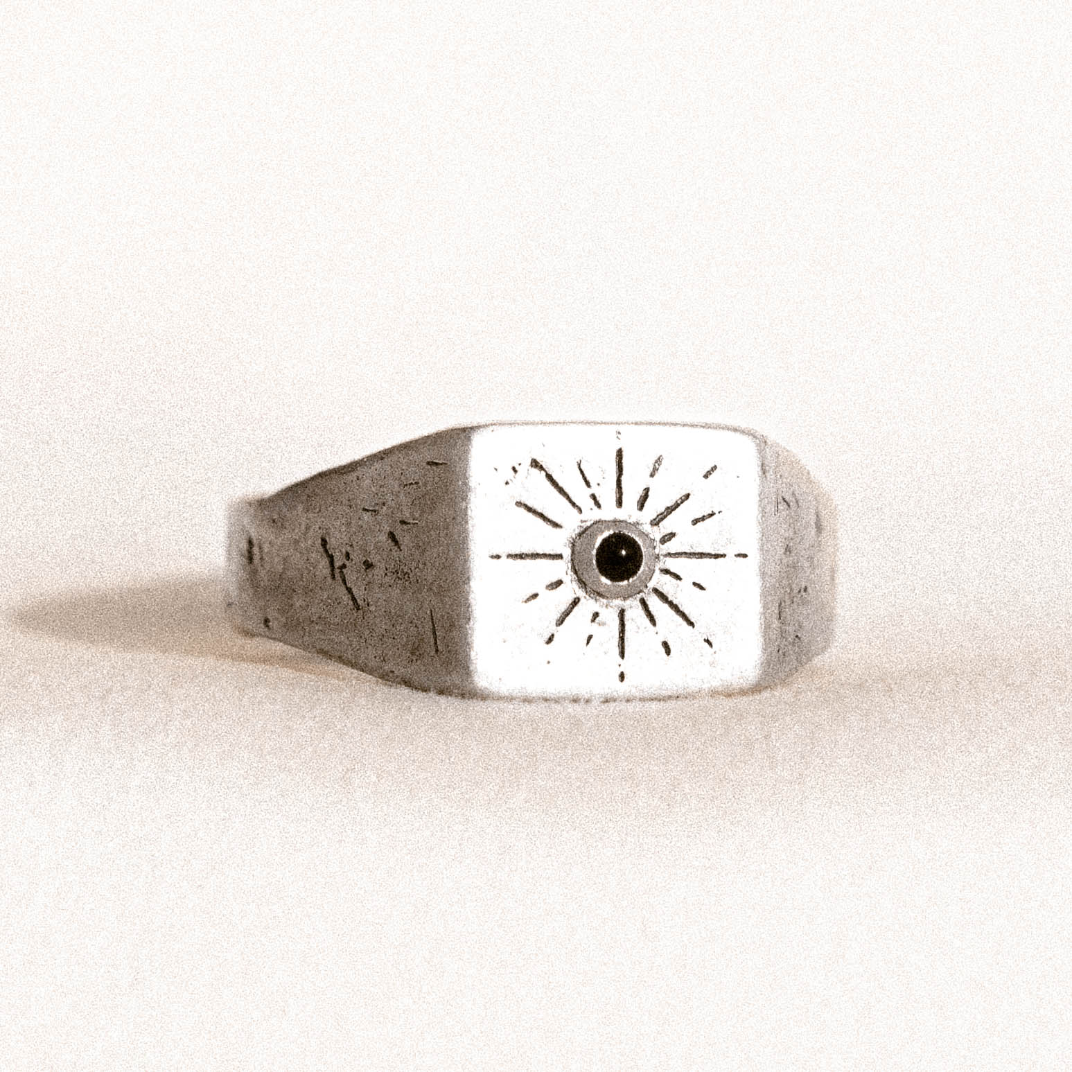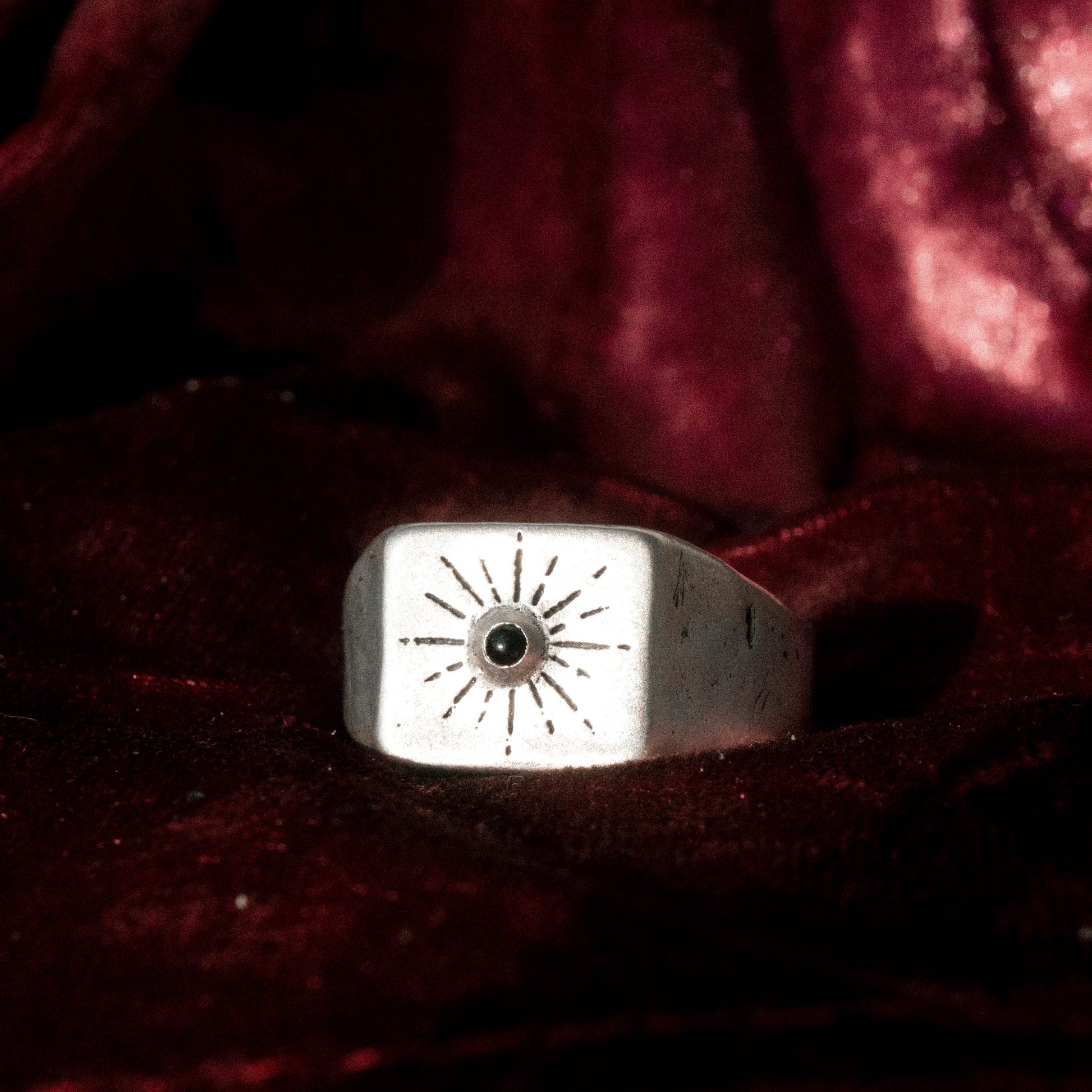 A solid, simple handcrafted signet ring, forged from 100% recycled 925 silver. The Chaos Theory's tapered band is peppered with small details, and on the top of the signet there is a black onyx stone, with engraved rays firing outward from its center.