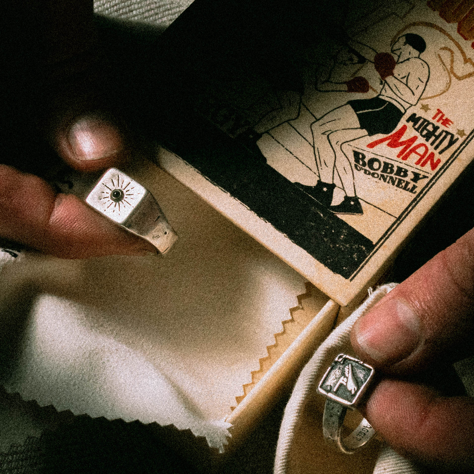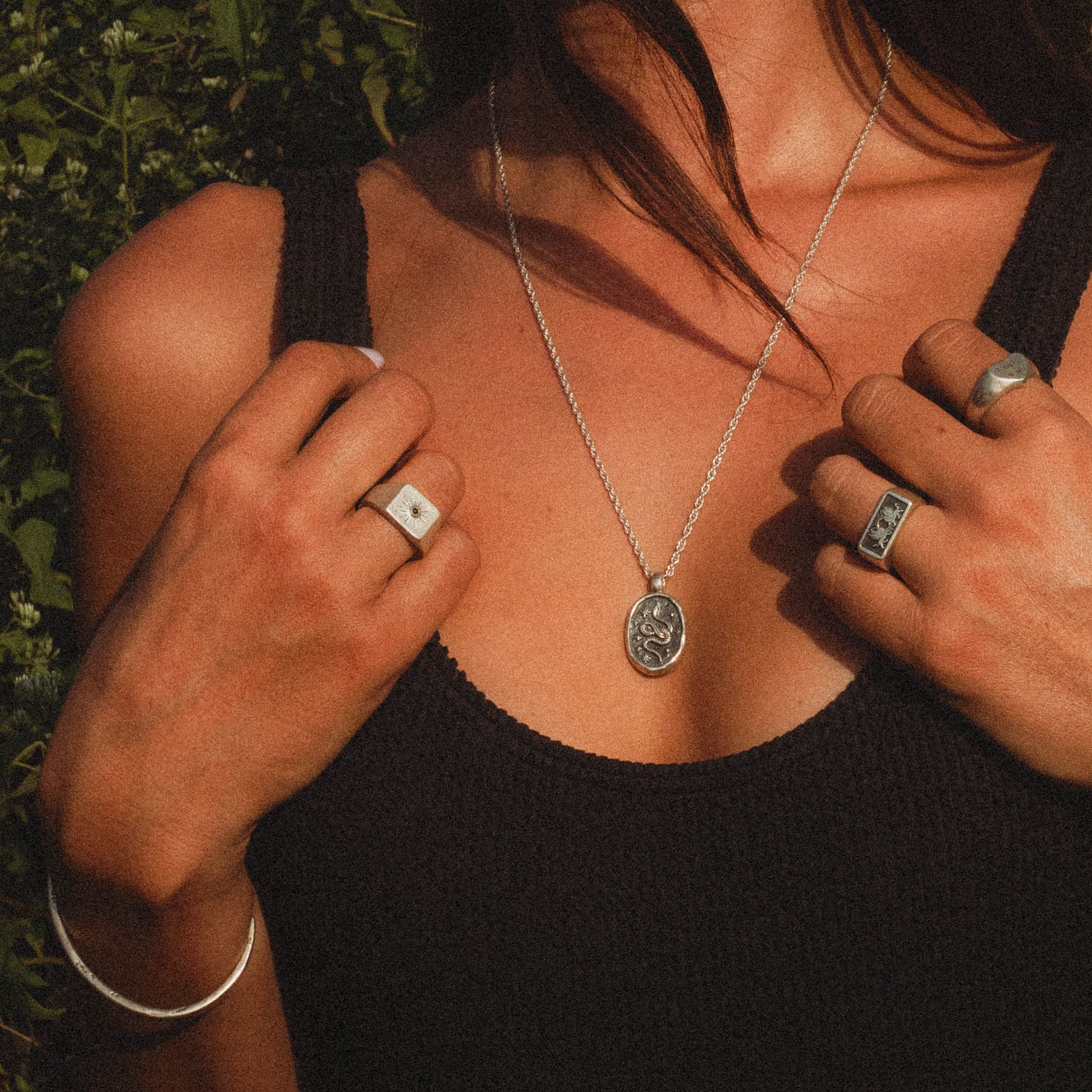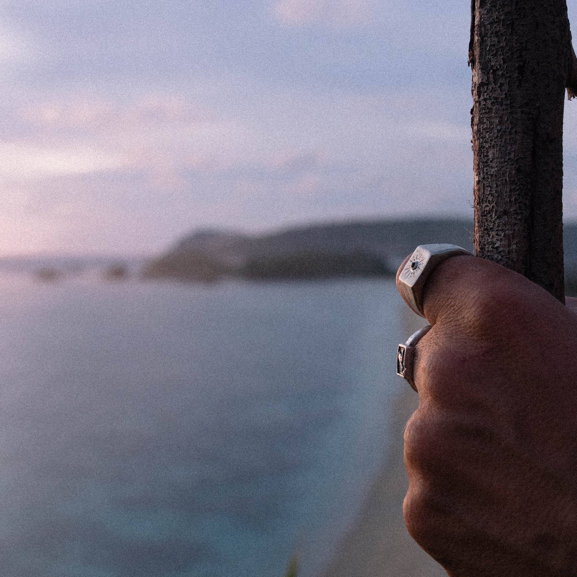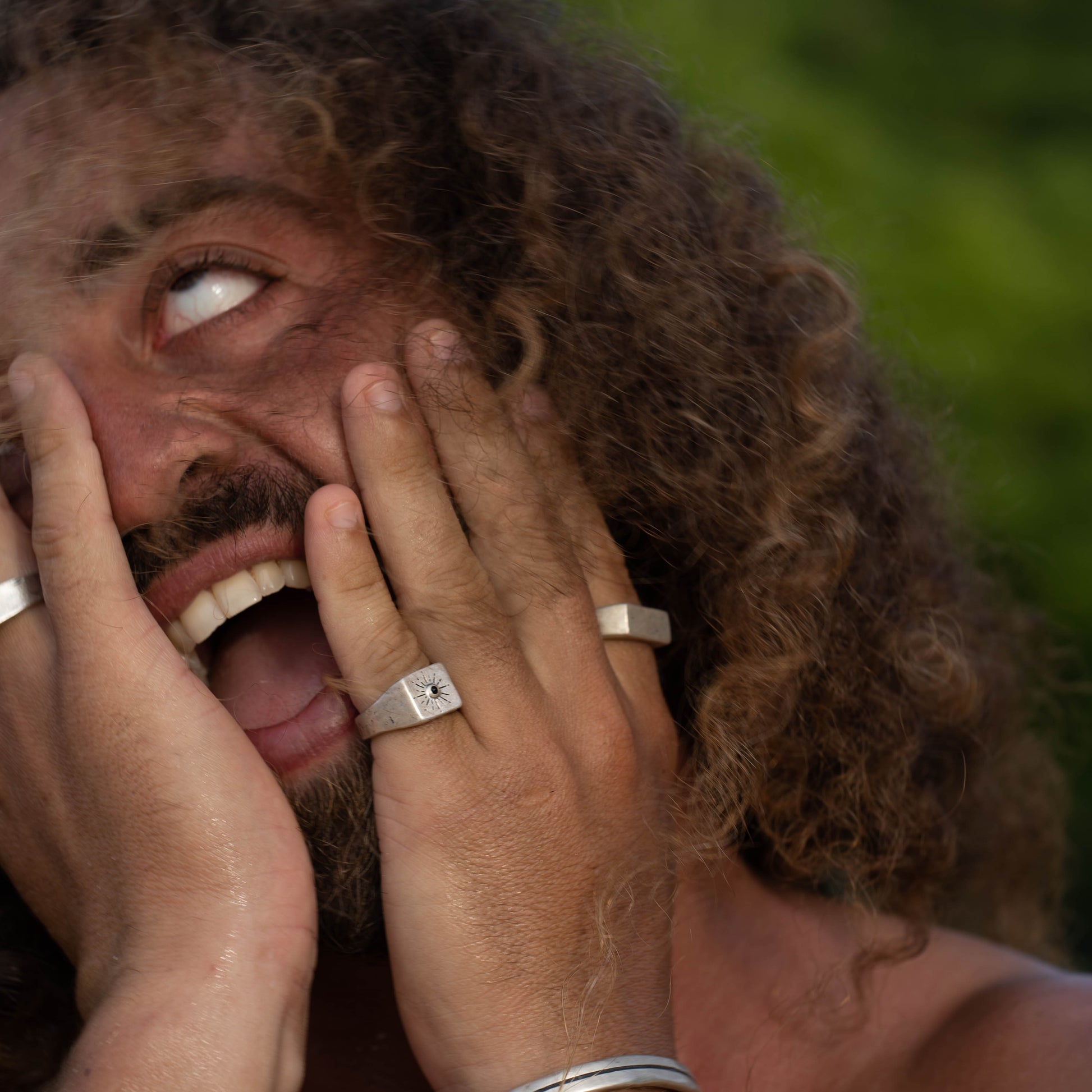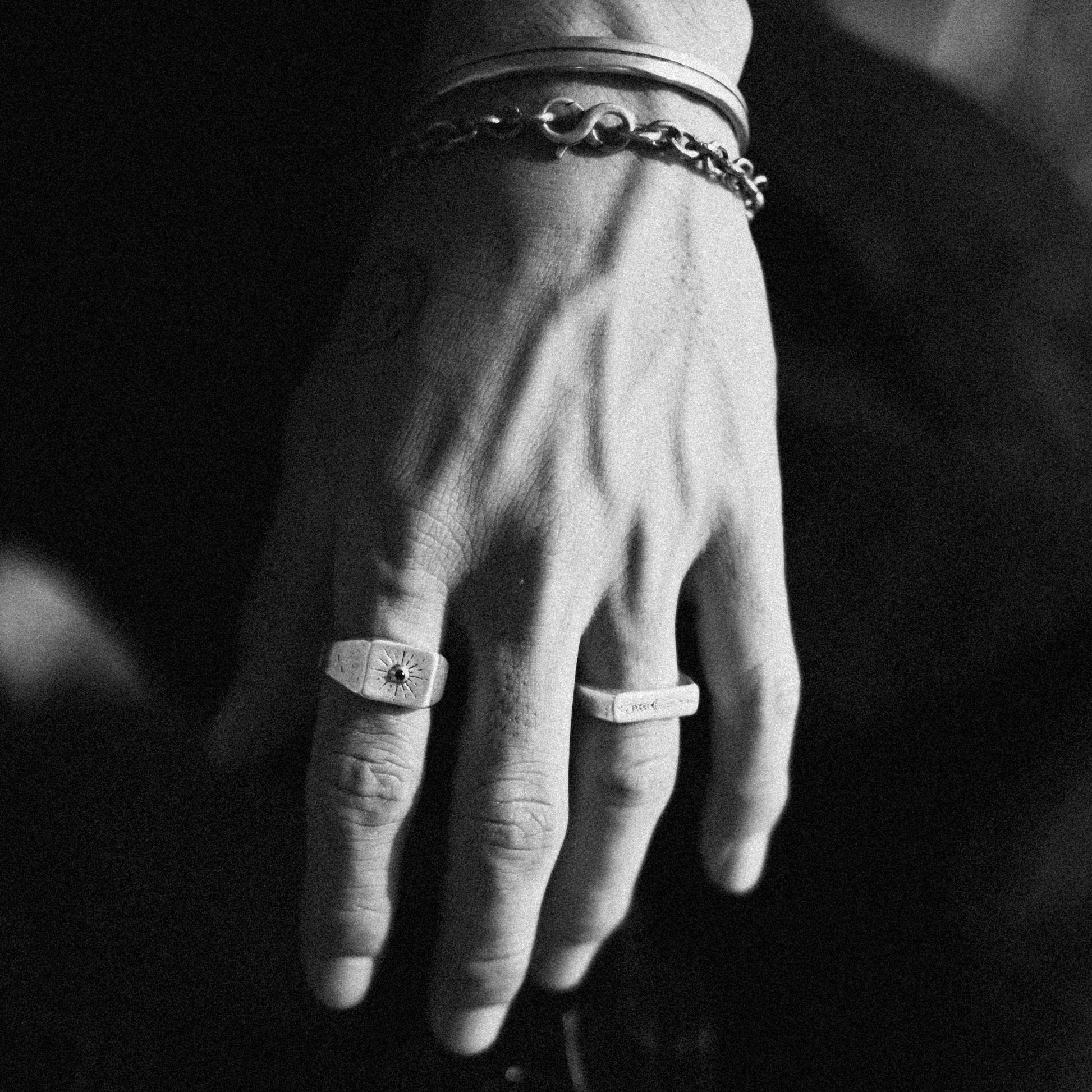 A solid, simple handcrafted signet ring, forged from 100% recycled 925 silver. The Chaos Theory's tapered band is peppered with small details, and on the top of the signet there is a black onyx stone, with engraved rays firing outward from its center.