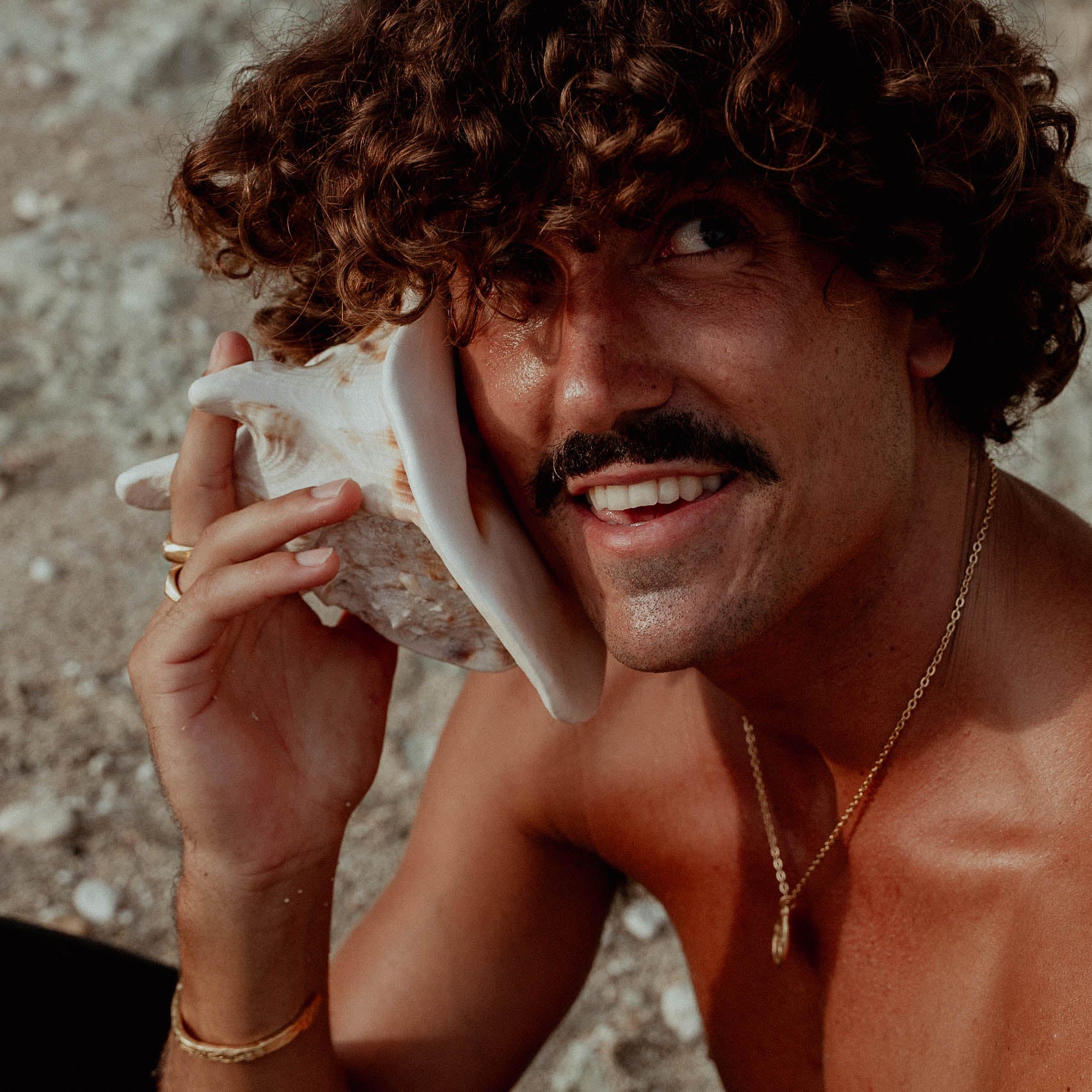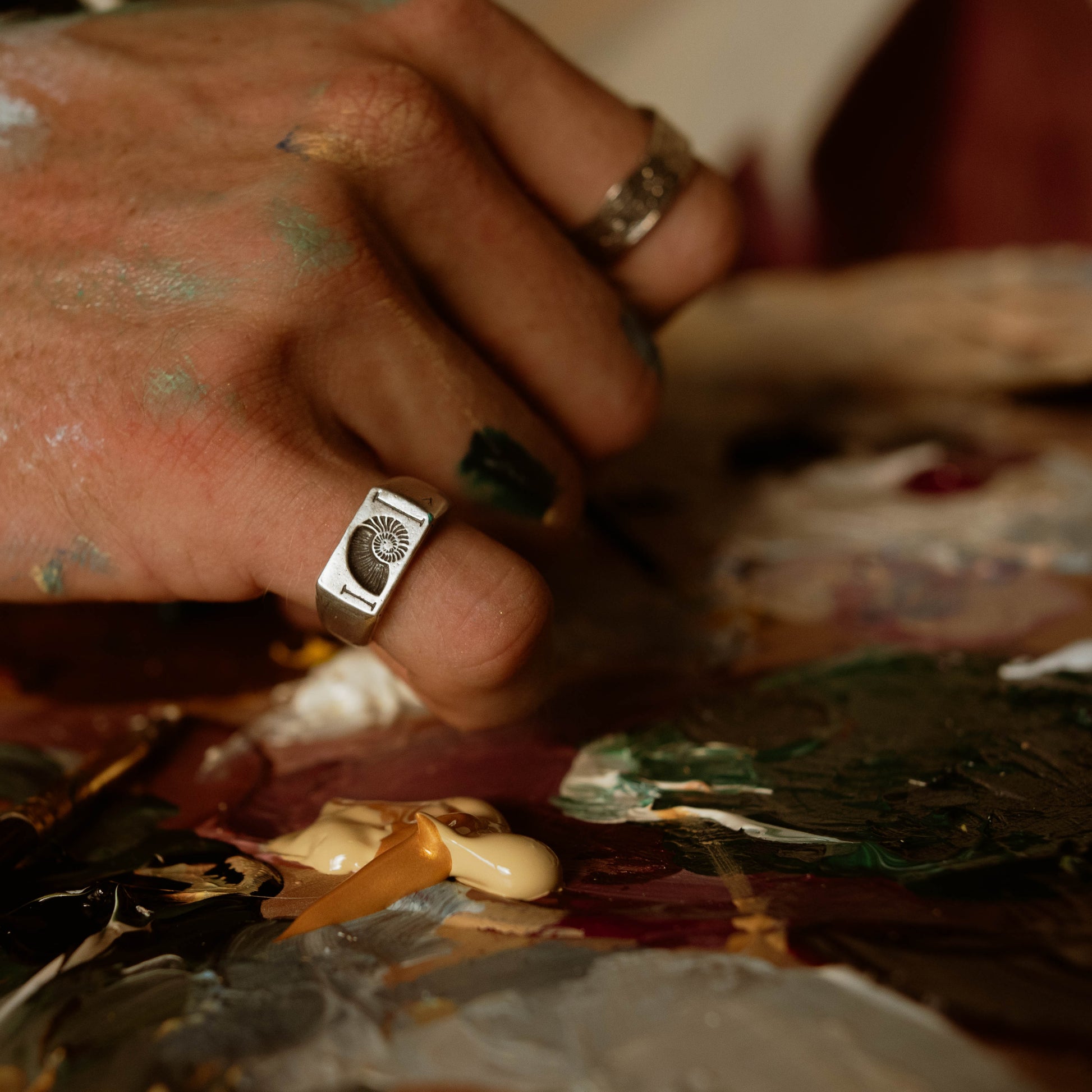 A solid silver signet ring, handcrafted from recycled 925 silver. Features the etched imprint of a seashell representing the fibonacci spiral to highlight the perfection of nature. The signet itself is long and rectangular, with slightly curved sides, and the ring features sublte markings that tell the story of time.