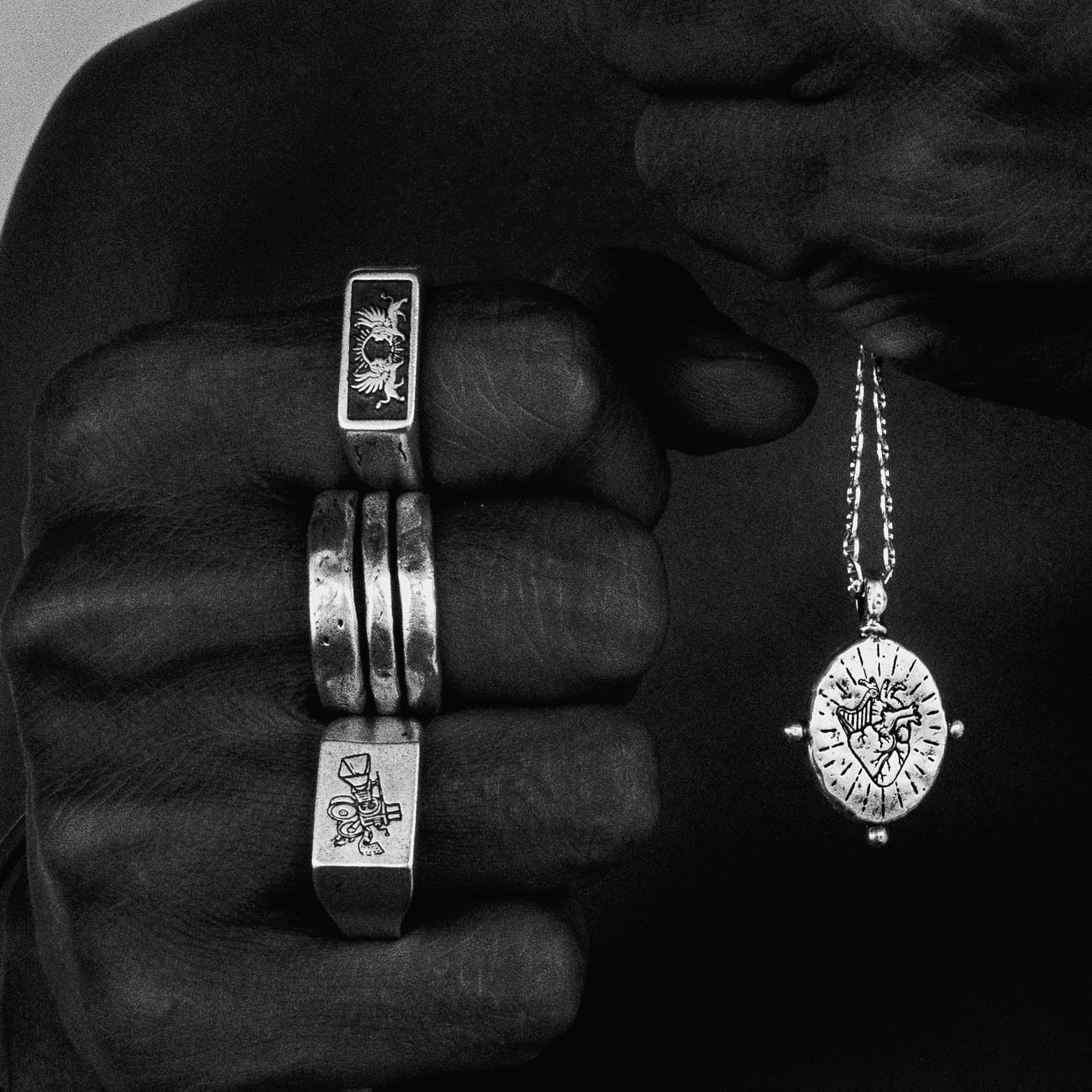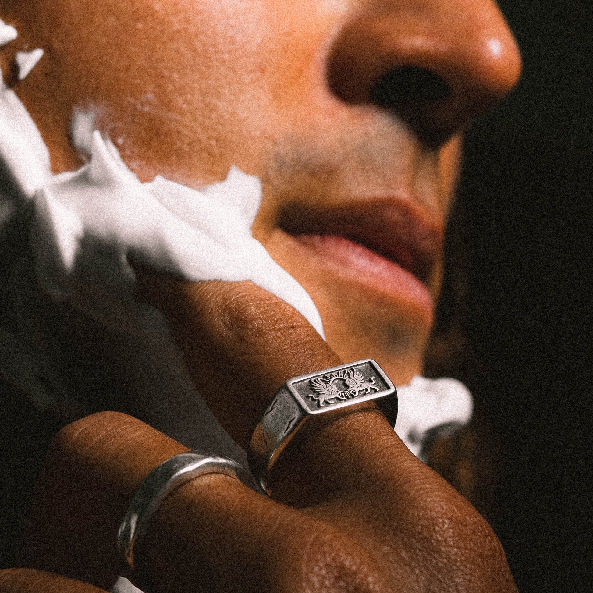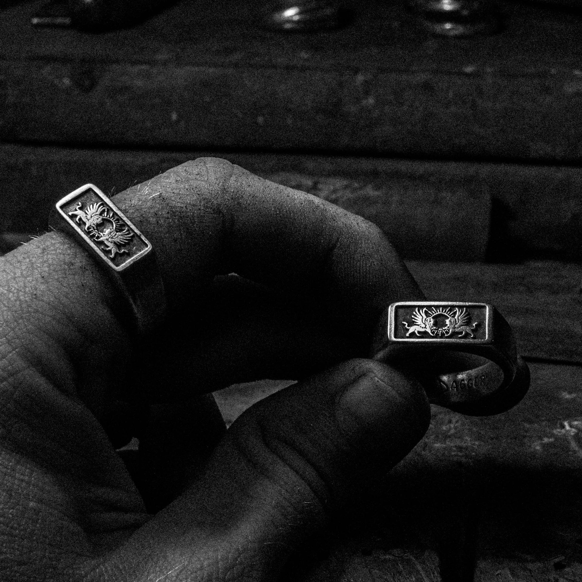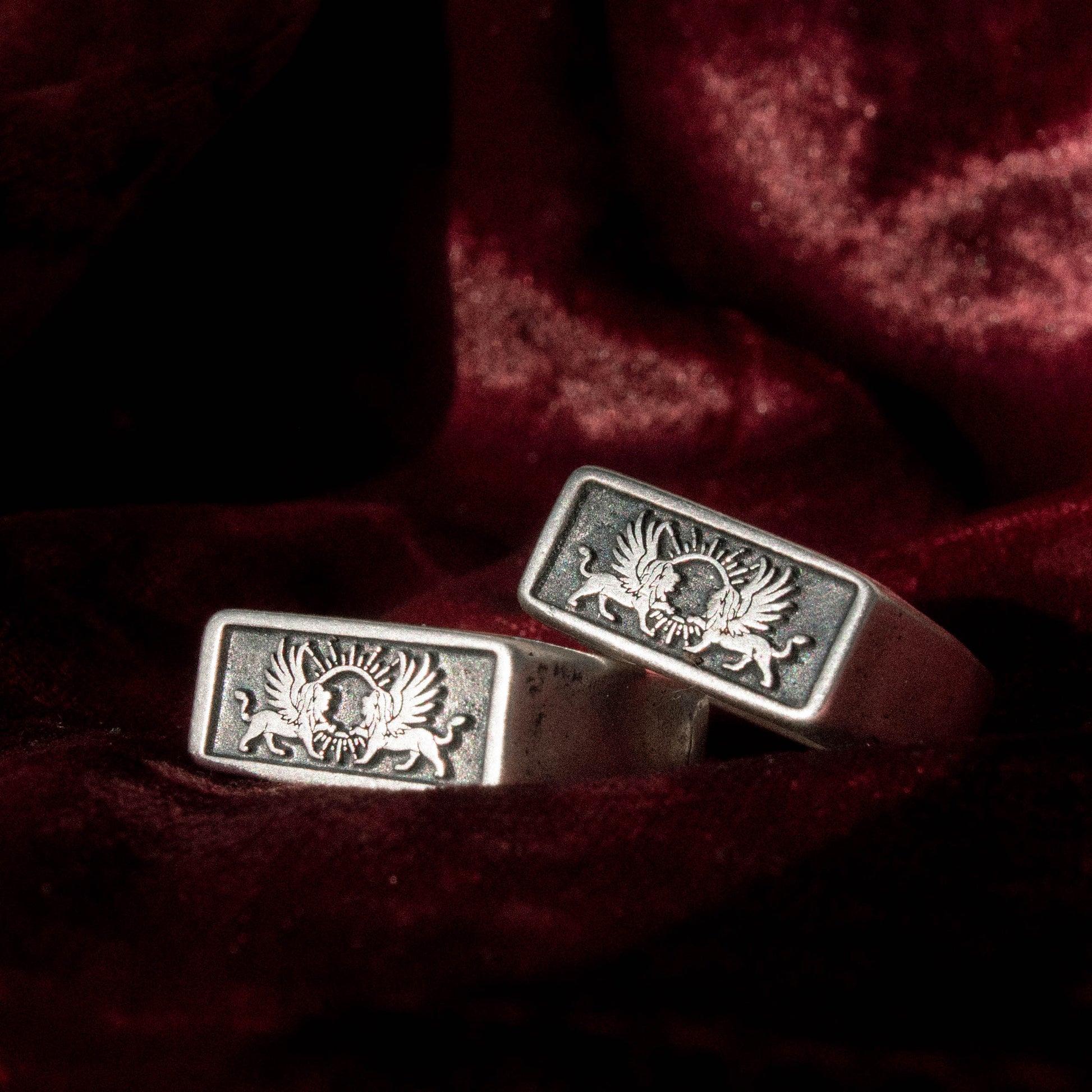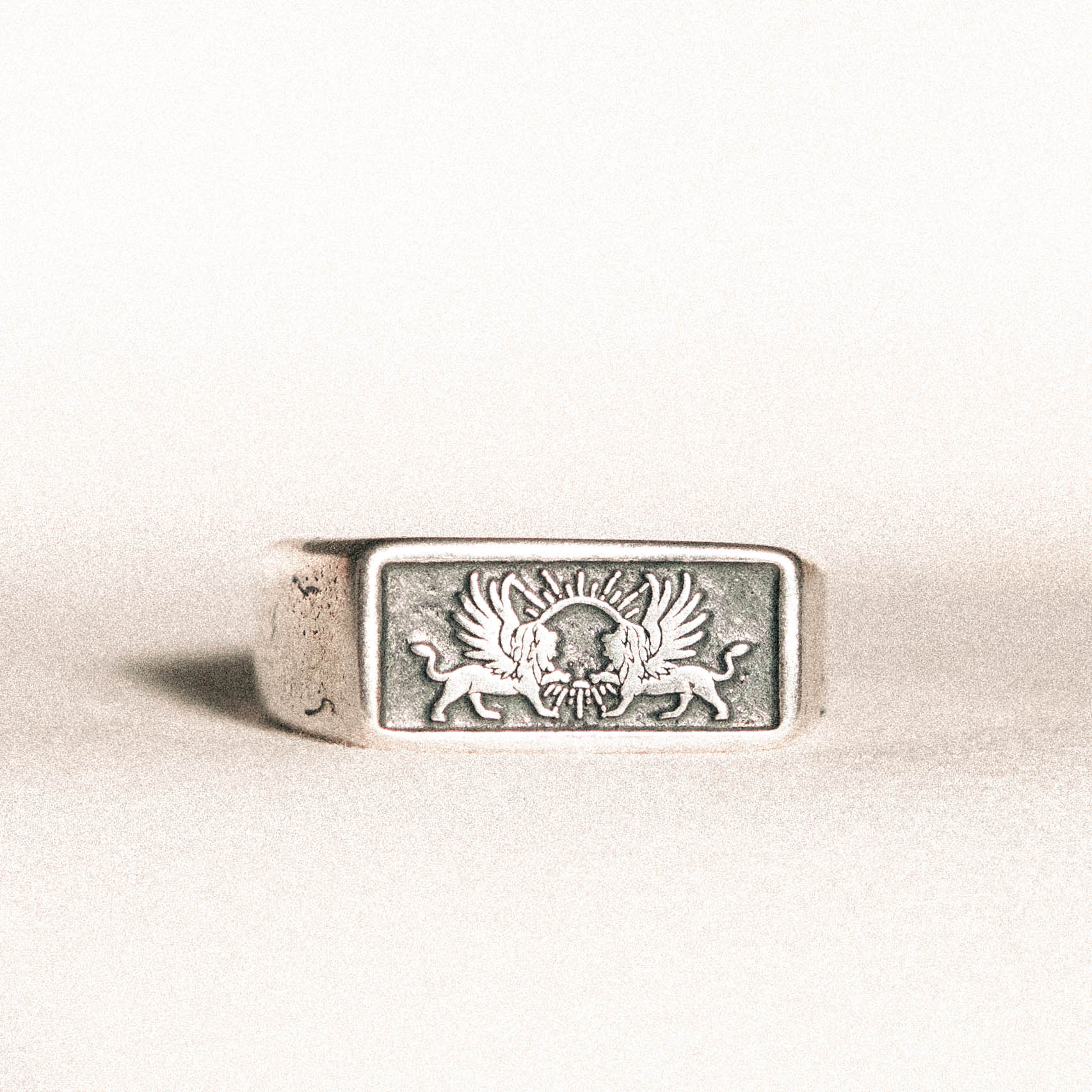 A handforged signet style ring, crafted from 100% recycled 925 sterling silver. The top face of the signet features a relief of two griffins around a central sun motif. The finishing of the ring is textured to tell the story of time's passage.
