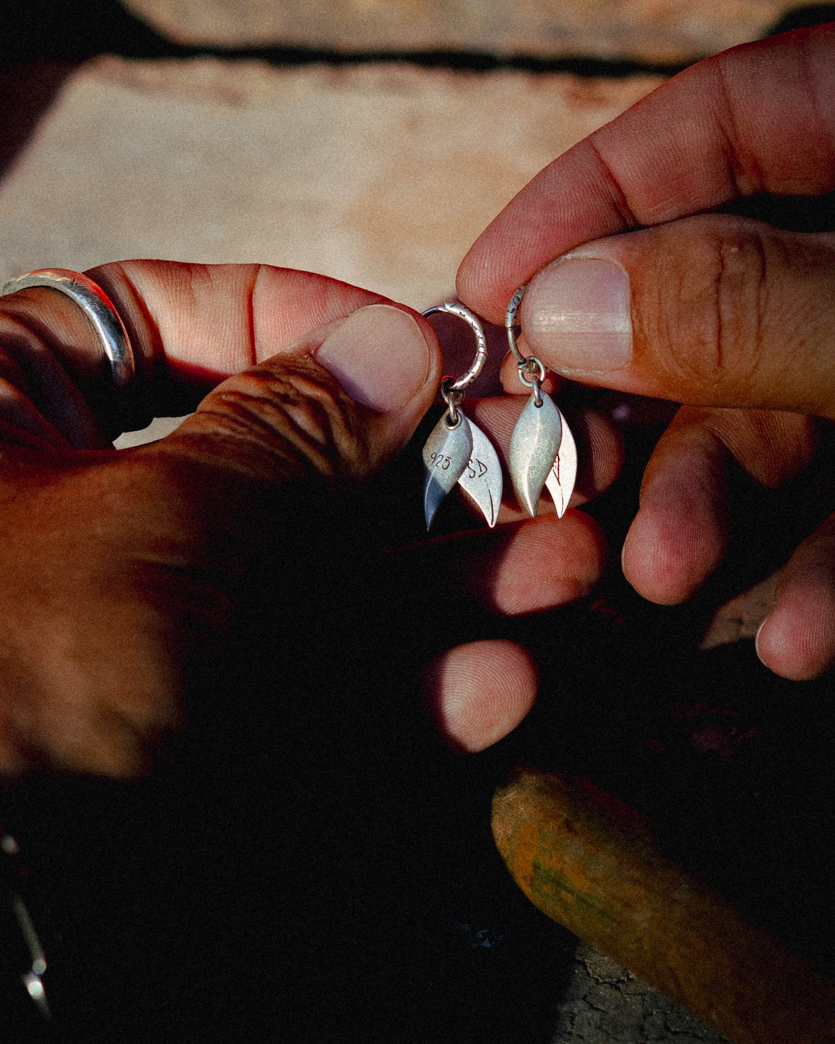 A pair of handcrafted earrings made from solid 925 sterling silver. Each earring is composed of two pieces that fit seamlessly together but can slide apart to reveal a dagger within. The finish on the earrings is smooth with a slight porous texture and a gentle concave shape that brings it to a subtle point.