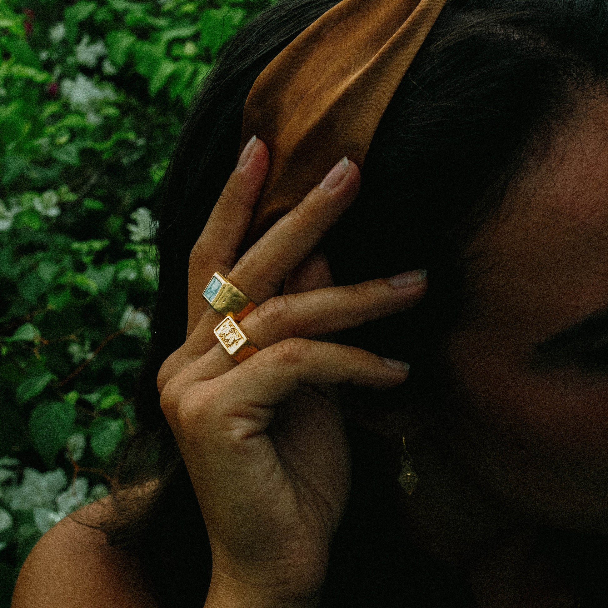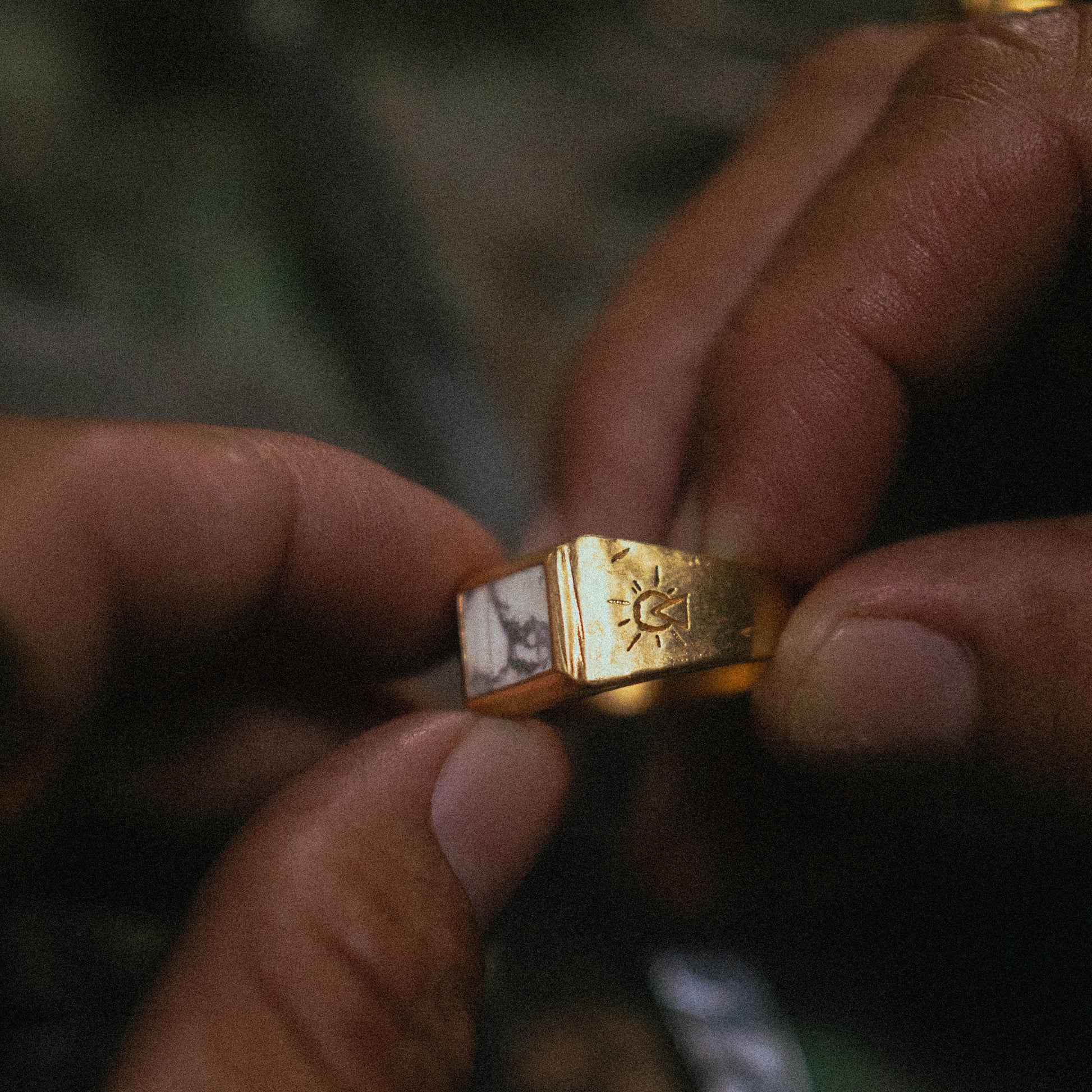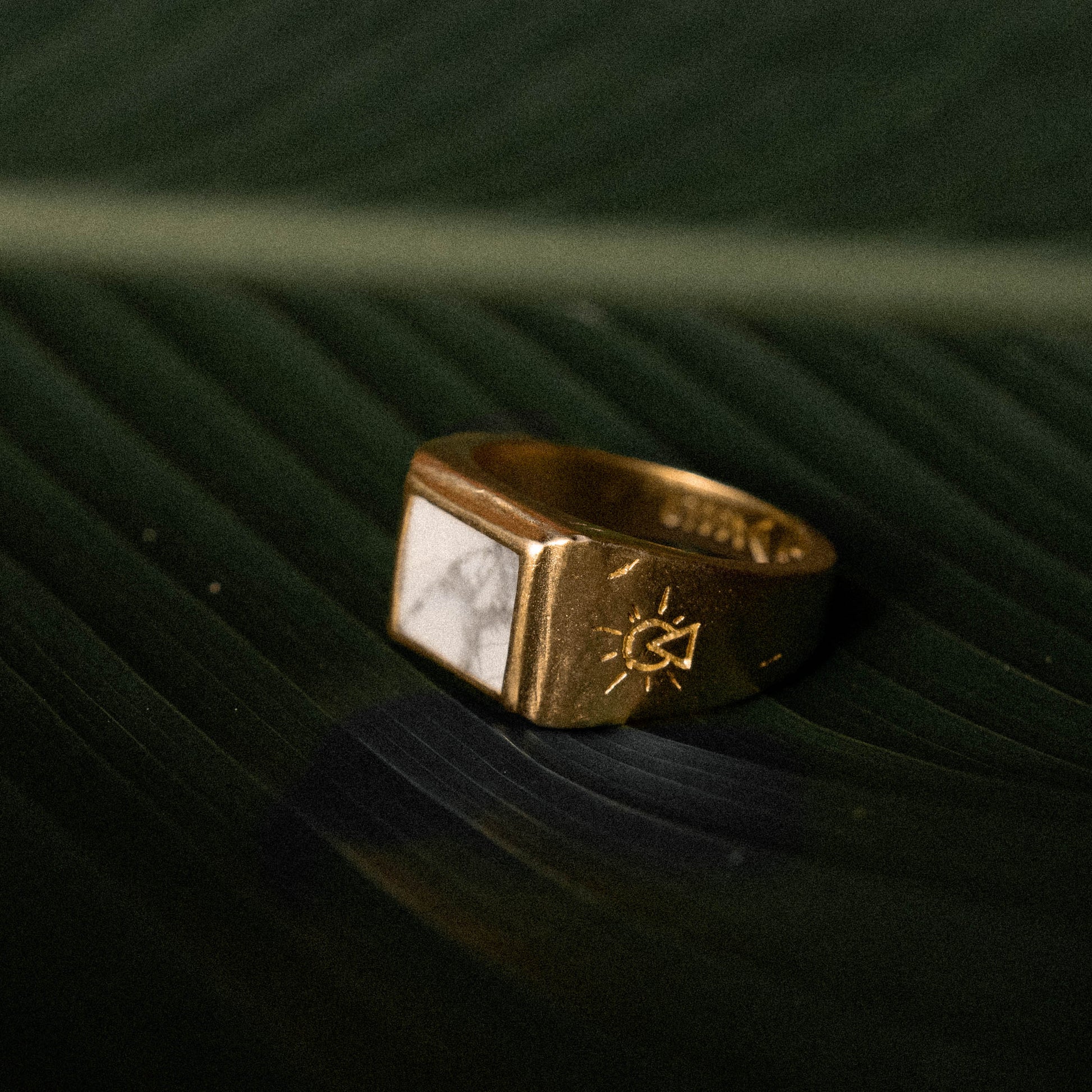A 24k gold plated signet ring with a handcrafted recycled 925 silver core. The ring features a block of white howlite which is held in place by formed metal, making it extra secure and removing the need for glue.
