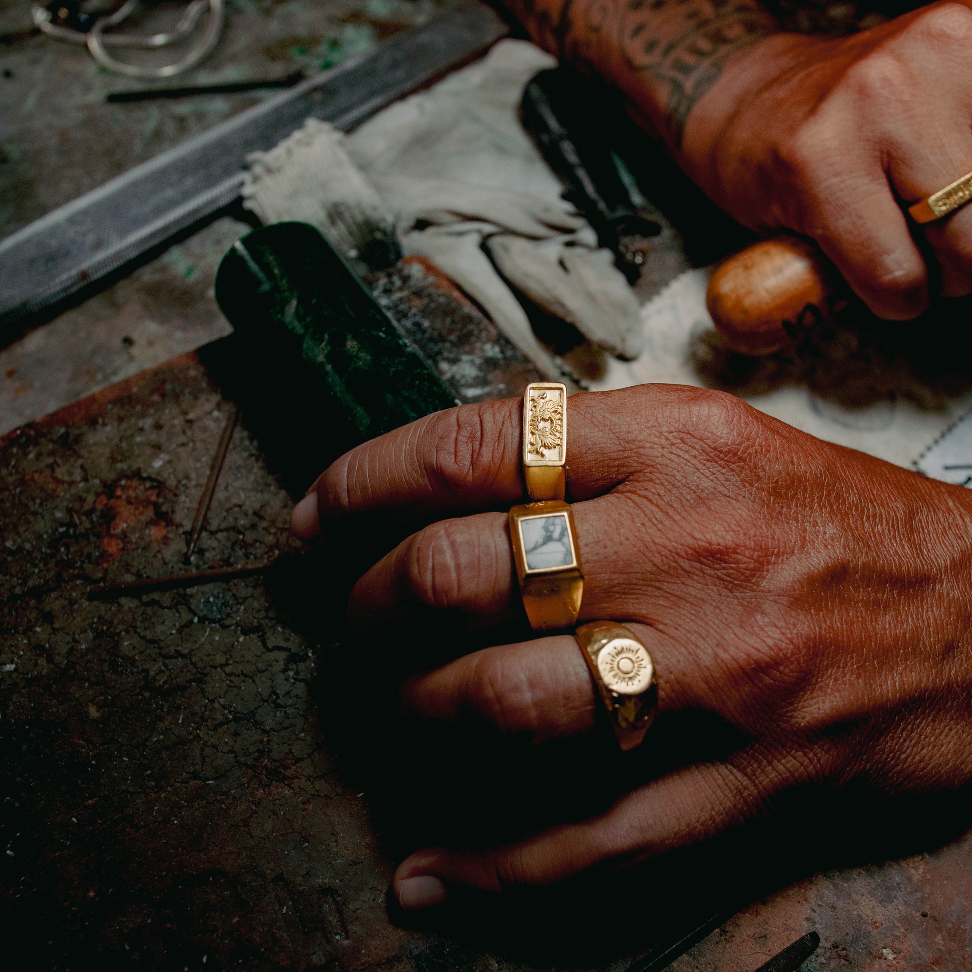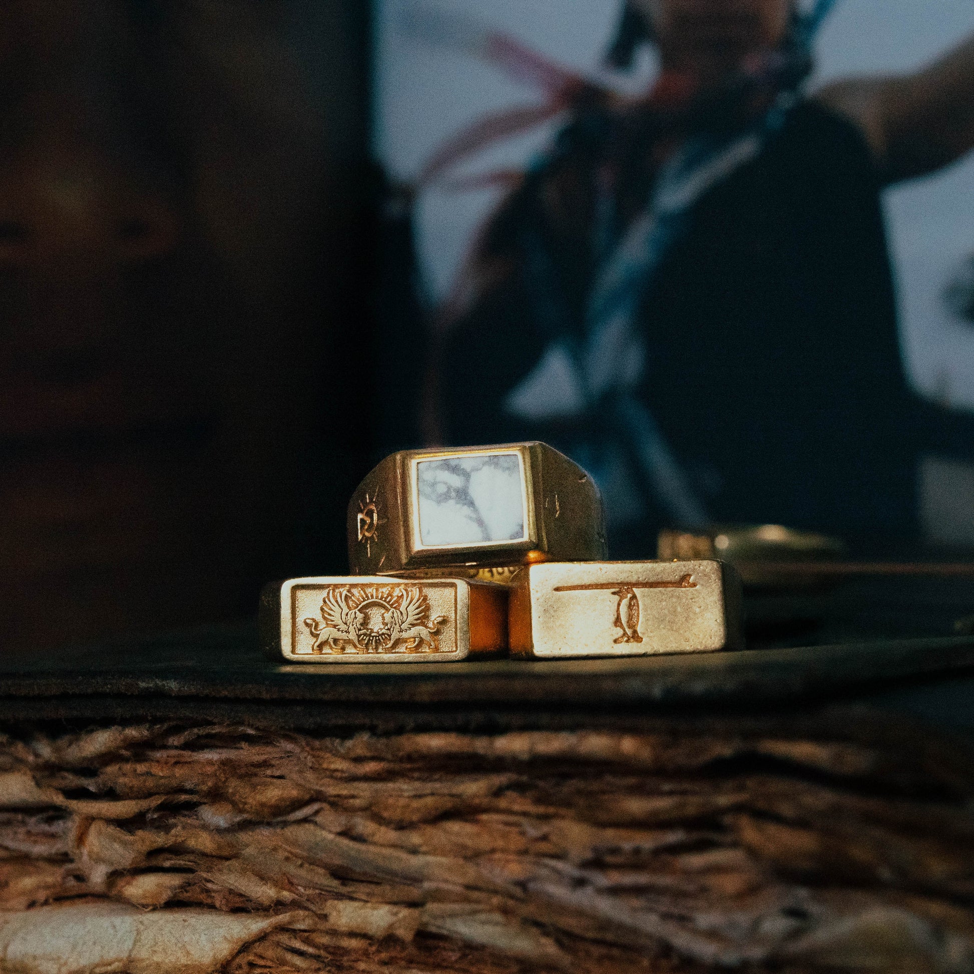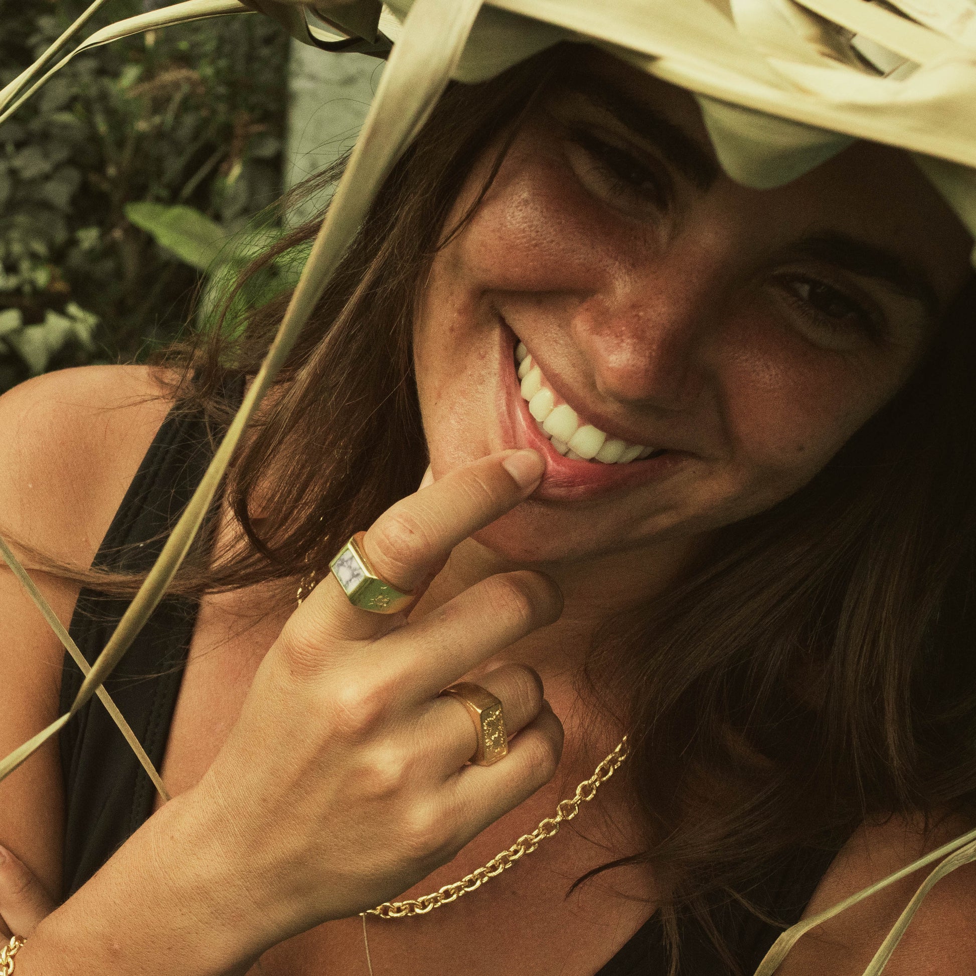 A 24k gold plated signet ring with a handcrafted recycled 925 silver core. The ring features a block of white howlite which is held in place by formed metal, making it extra secure and removing the need for glue.