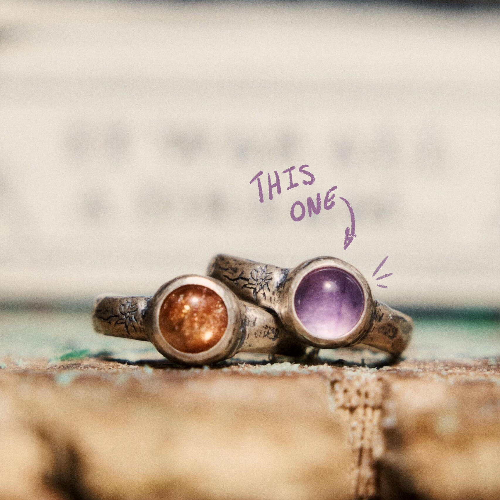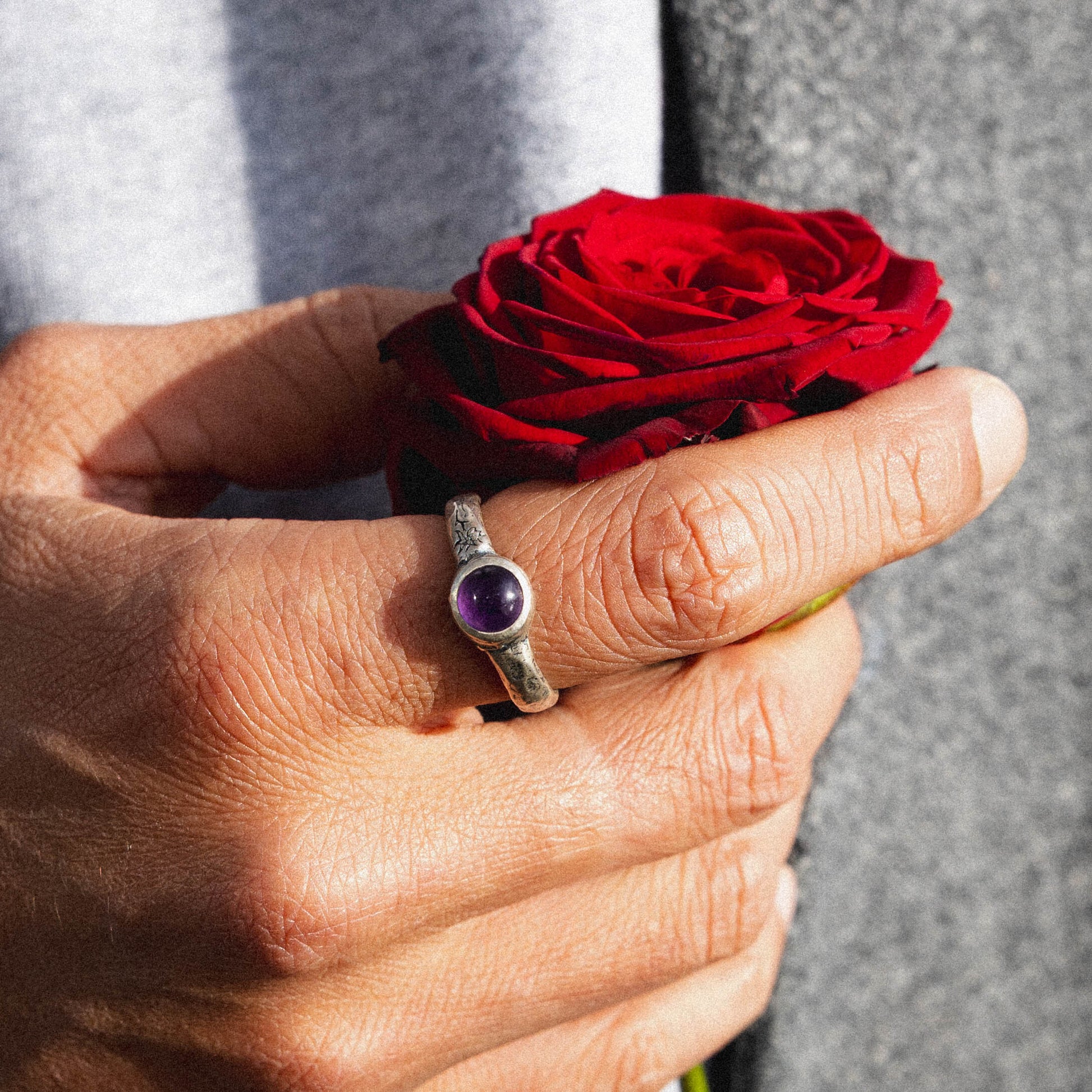 A thin band ring crafted from 100% 925 recycled silver with a pristine amethyst stone set into the top side. The inside of the band features a cute little flower engraving.