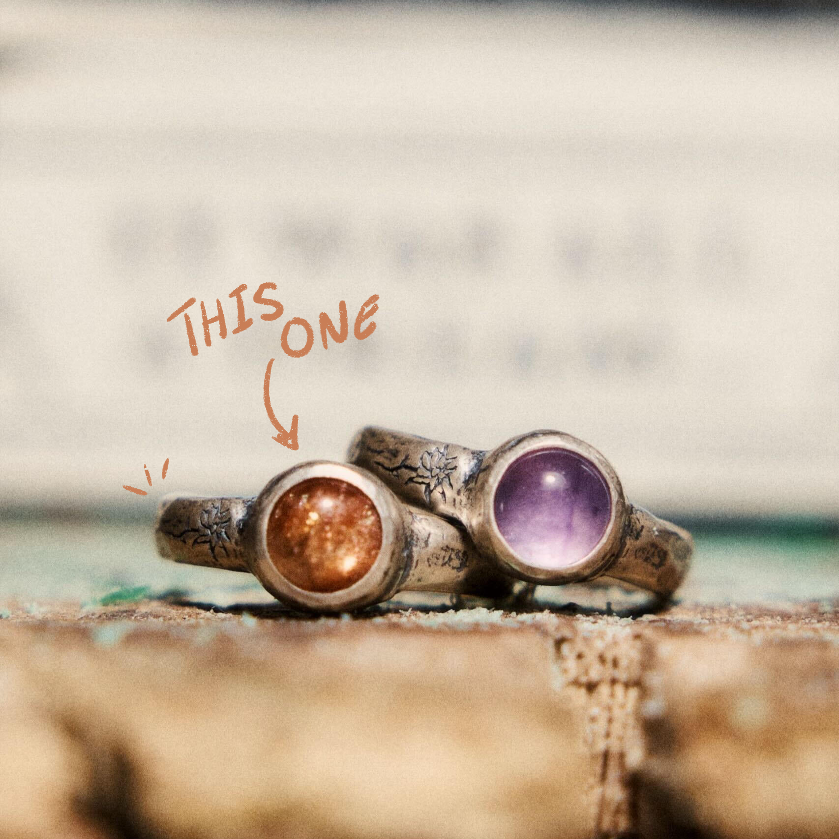 A thin band ring crafted from 100% 925 recycled silver with a pristine sunstone set into the top side. The inside of the band features a cute little flower engraving.