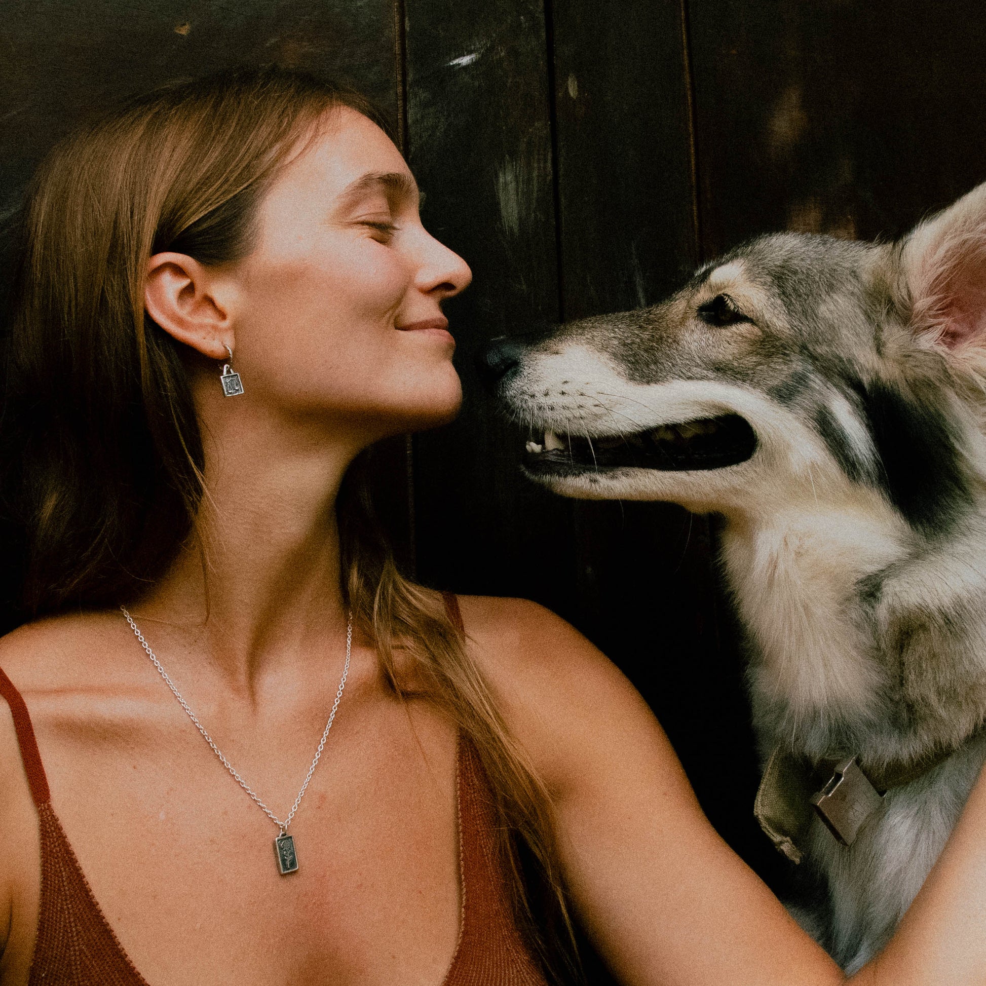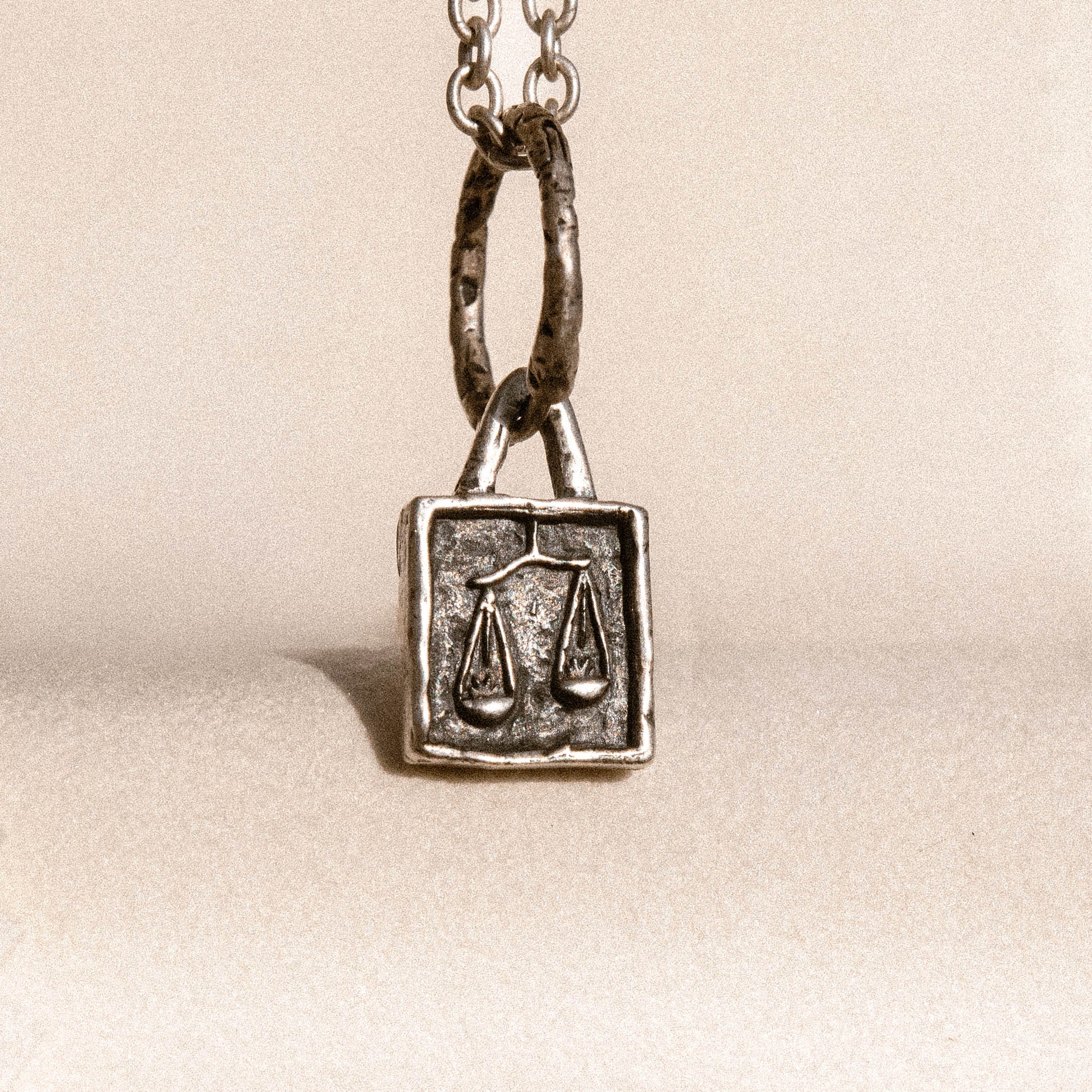 A pair of handcrafted earrings made from solid recycled 925 sterling silver. Each piece features a square-shaped dangle with a set of scales embossed on their fronts, each holding a small flame. All components are textured with subtle marks and etchings to tell the story of time.