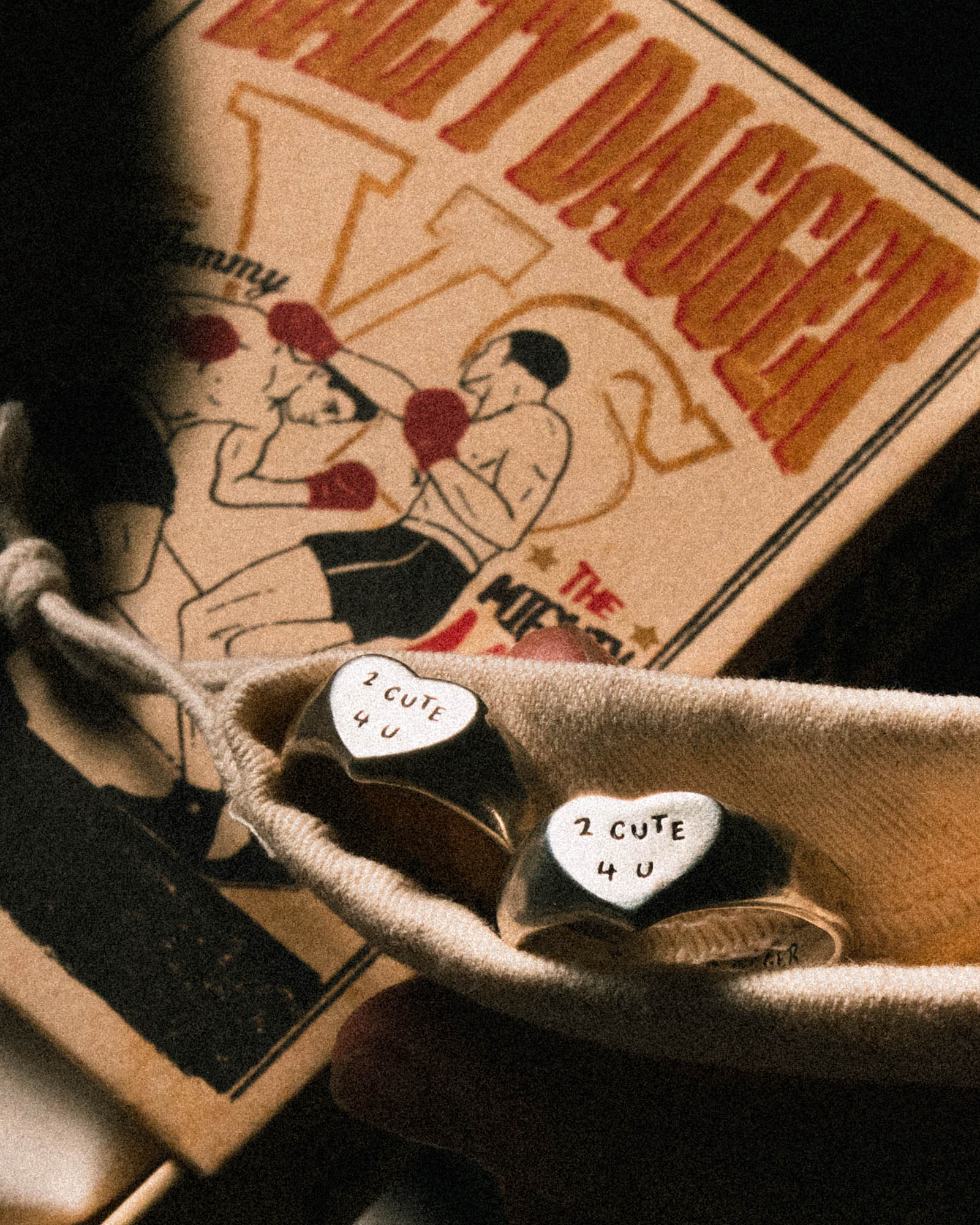 A handcrafted silver signet ring made from recycled 925 sterling silver. The smooth heart-shaped signet features the text 2 cute 4 u, and the band of the ring has a relatively clean finish with just a few subtle marks to tell the story of time.
