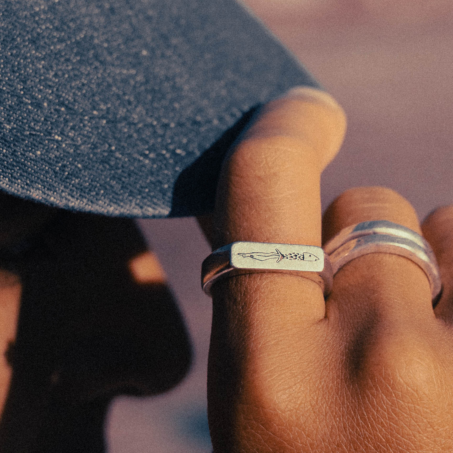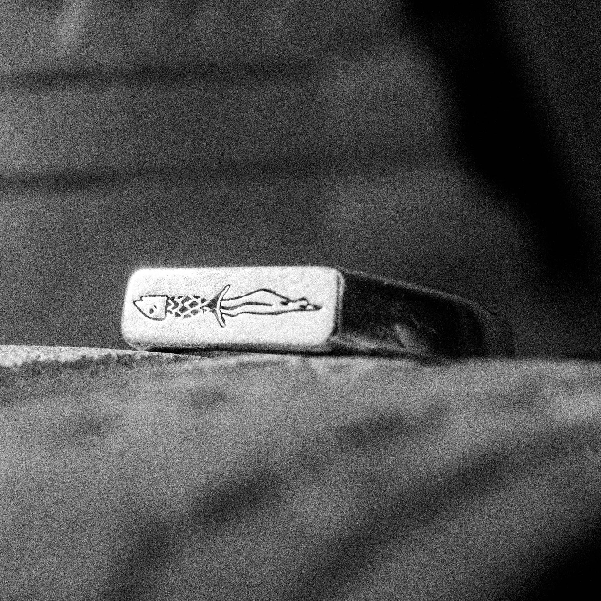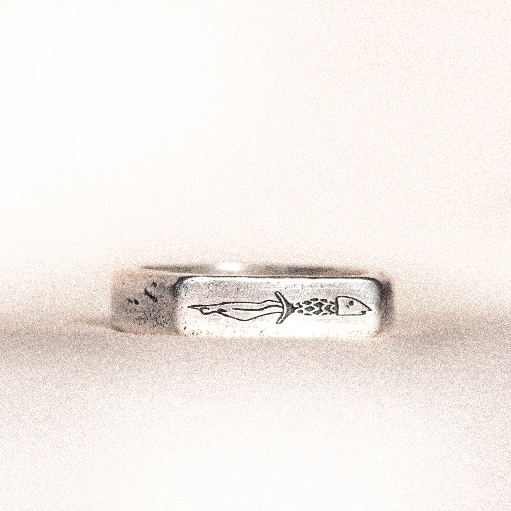 A handforged thin rectangular signet ring, crafted from 100% recycled 925 sterling silver. The top face of the signet features an engraving of a curved dagger whose handle mimics a fish.