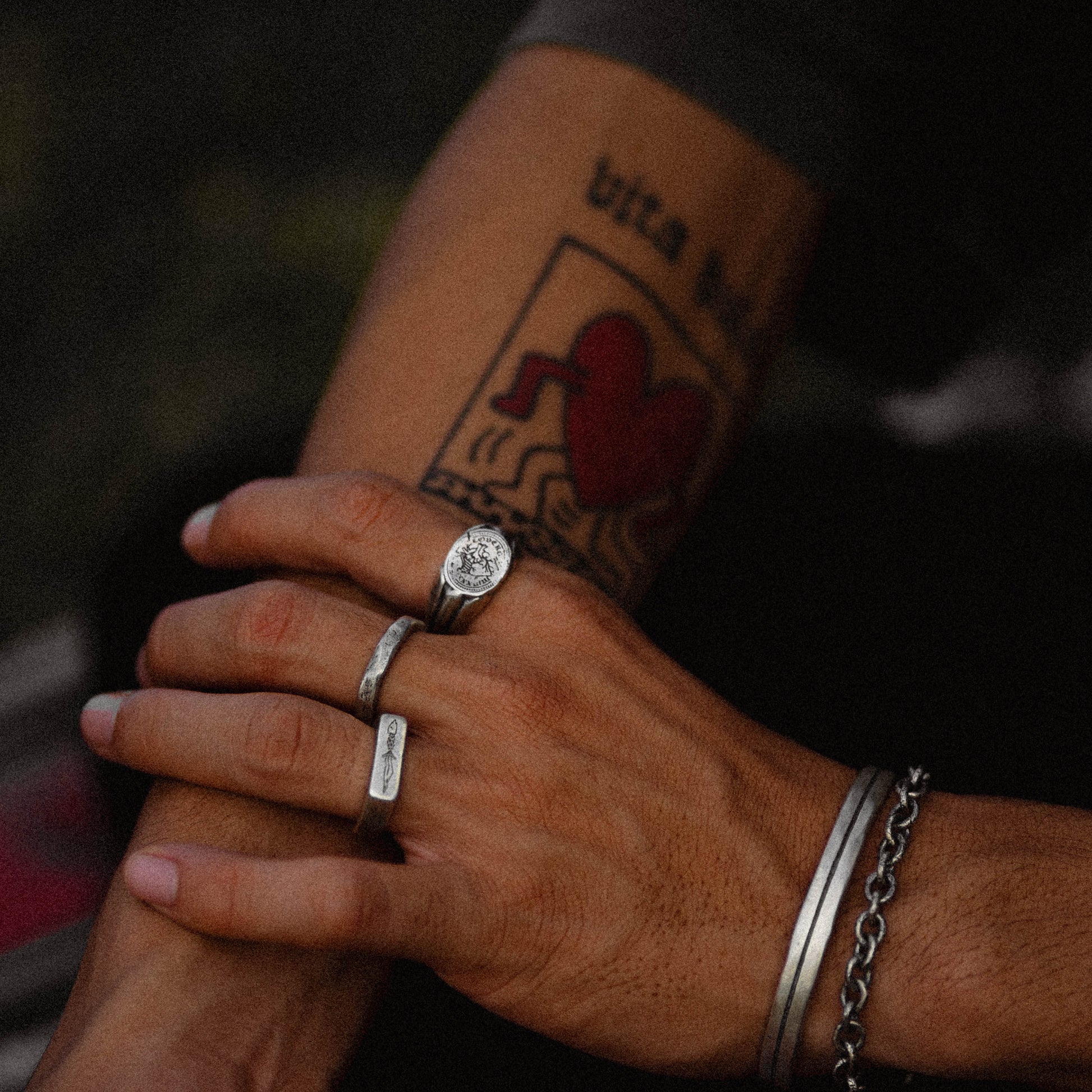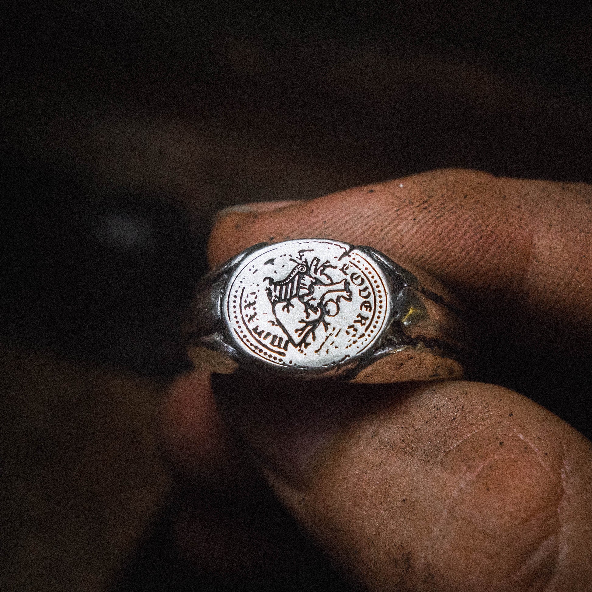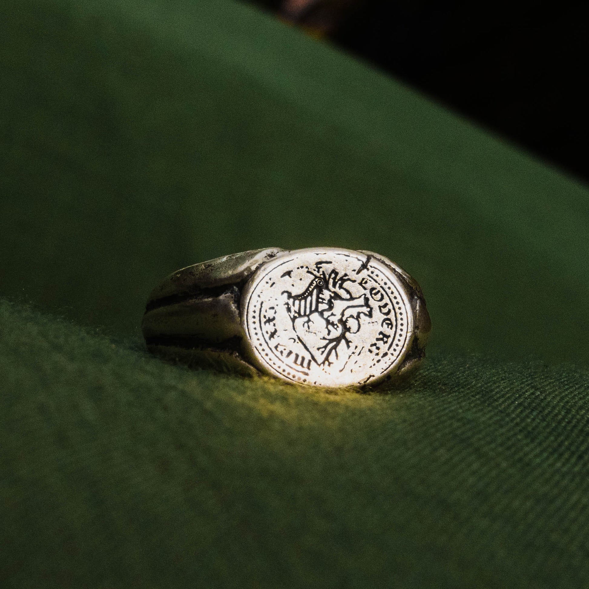 A handforged circular signet ring with a tapered band, plated with 3.5 microns of 24k gold and an additional layer of 18k gold for strength. The core of the ring is made from 100% recycled 925 sterling silver. The top face of the signet is engraved with a realistic heart, and the sides of the band feature deep grooves. The finishing is relatively clean with subtle markings to tell the story of time's passage.