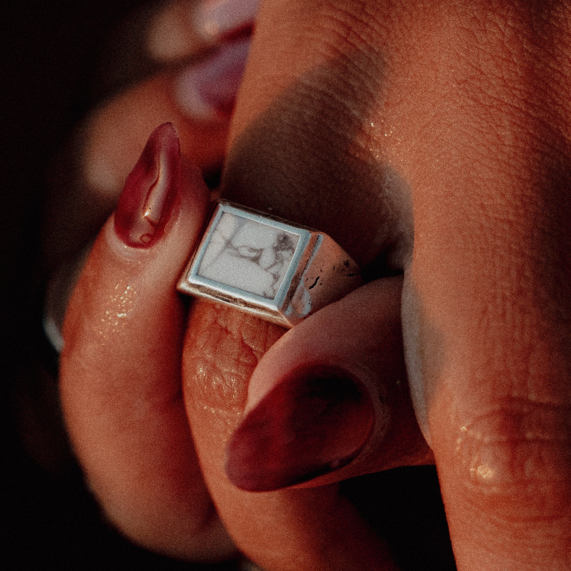 A solid handcrafted signet ring made from recycled 925 silver. The ring features a block of white howlite which is held in place by formed silver, making it extra secure and removing the need for glue.